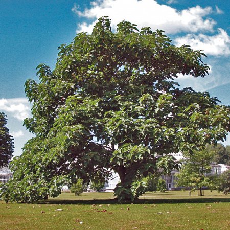 Flinke boom met brede kroon, dikke takken en twijgen. Eironde bladeren meestal tot 30 cm lang en breed. Op de sterk groeiende scheuten kunnen de bladeren tot 50 cm lang worden. De zachtbehaarde bloemknoppen zijn overwinterend, daardoor bevriezen ze regelmatig. Paarse, geurende bloemen van 5-6 cm lang met gele strepen, in grote bloempluimen die 25-40 cm lang kunnen worden, april-mei vlak voor de bladontwikkeling. Groeit liefst op een niet te natte bodem.